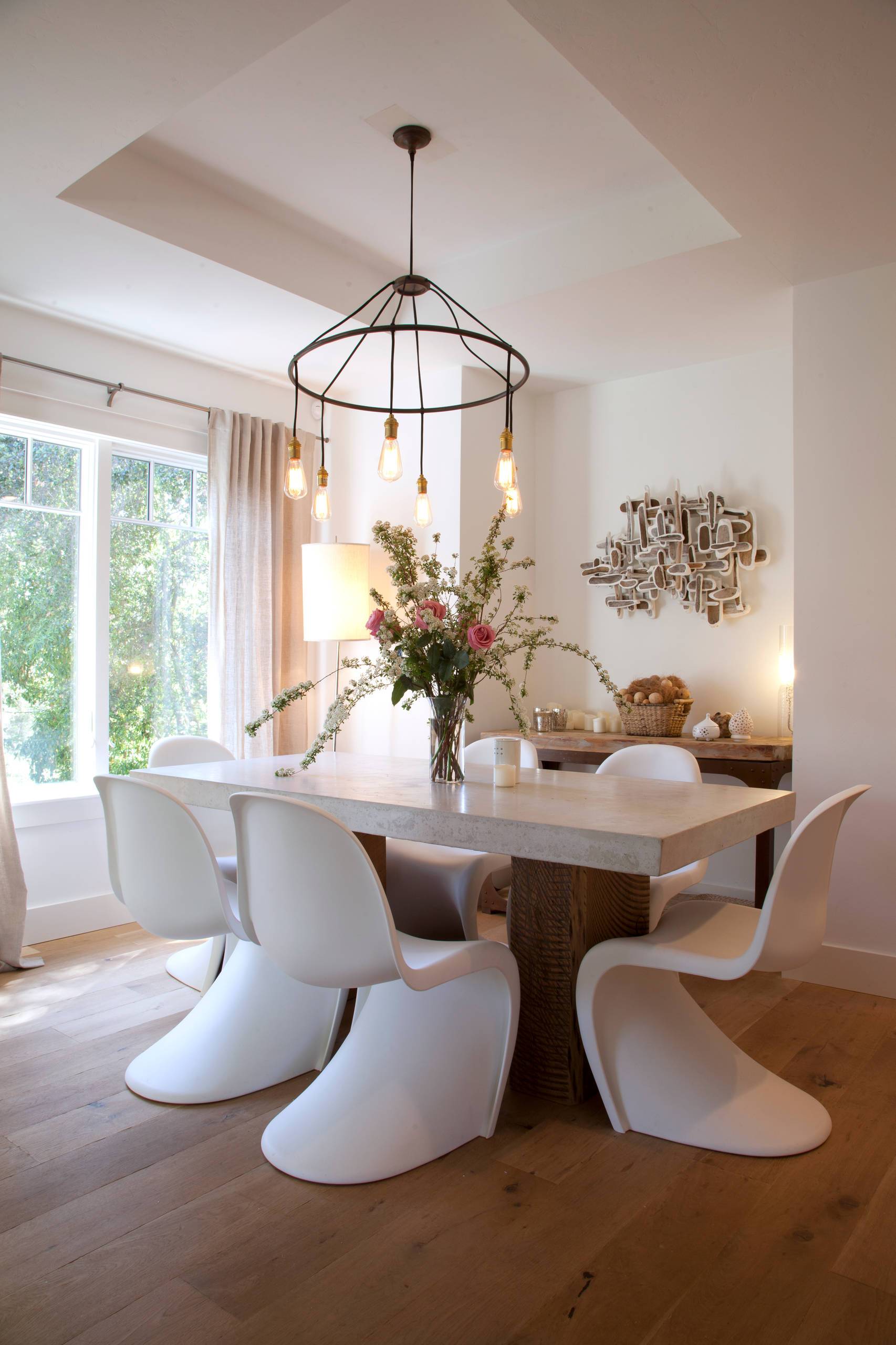 Mirrors are a versatile decor element that fits any style. If you aren’t sure what type of accessories to include, mirrors will always match your theme. These three round mirrors anchor the dining area while reflecting the natural light.