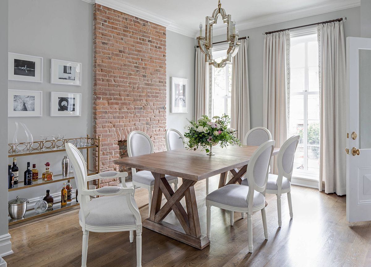 Gone are the days when you had homeowners scurrying around to cover up the brick walls in their house. Today, you have them peeling back layers of plaster in an effort to find those old concealed brick walls! Trendy and adding textural charm to any space they adorn, brick walls in the dining room make an impact instantly. You can either choose to use them as an accent addition or give the entire dining room a brick wall backdrop. If you are not blessed with a home that has brick walls, then faux brick comes to your rescue.