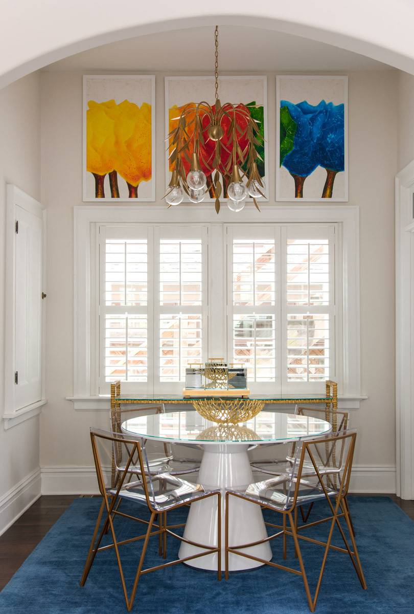 A dining room with plenty of windows will be airy and bright. However, it will not have much space for displaying wall decor. But you can always get creative and find a way that works for your room. This dining room has a high ceiling, so they hung the vibrant artwork above the windows.