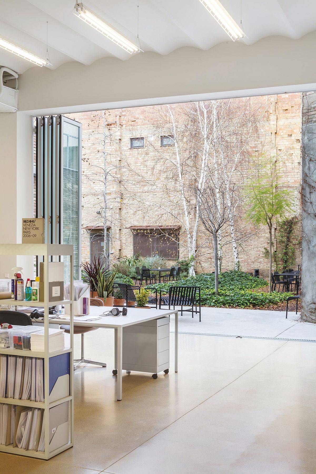 Renovated by Thomas Raynaud + Paul Devarrieux, the warehouse transformation relies on making most of the original structure, its spacious, industrial interior and the many possibilities to usher in ample natural ventilation. The warehouse now holds a large office space, a kitchen lab and accommodation and each of these spaces has an undeniable connection to the past of the structure. On the inside, one finds a white backdrop taking over in every section with large glass doors and windows connecting this rejuvenated office with the world outside. [Photography: Adrià Goula]