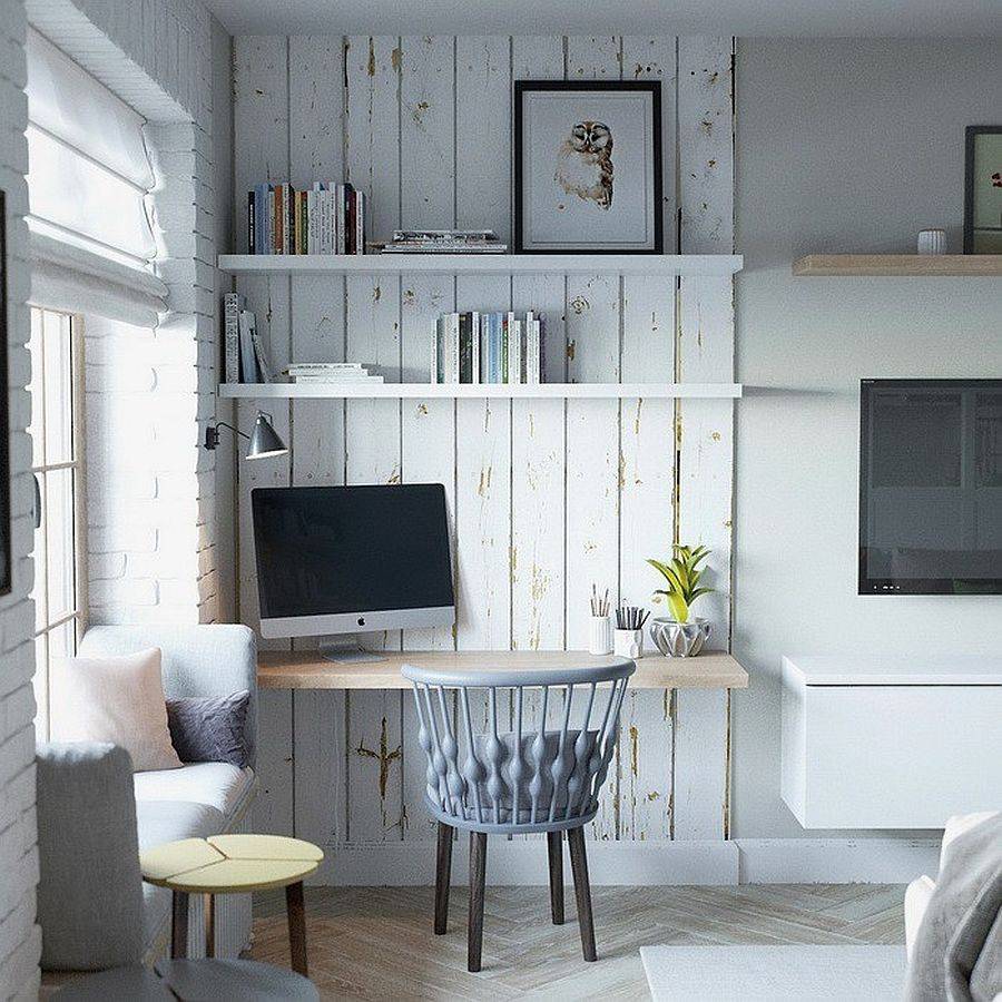 It is not just the style of the room that makes a difference in the small home office with storage and smart utilization of space making the biggest difference. Most often, a series of open shelves in the backdrop offers ample storage space here. In the rustic home workspace, you can turn to cabinets and shelves in wood to provide this storage option without moving away from the style. Corner floating shelves and wall-mounted upper cabinets add additional layers of storage without infringing on the available square footage.