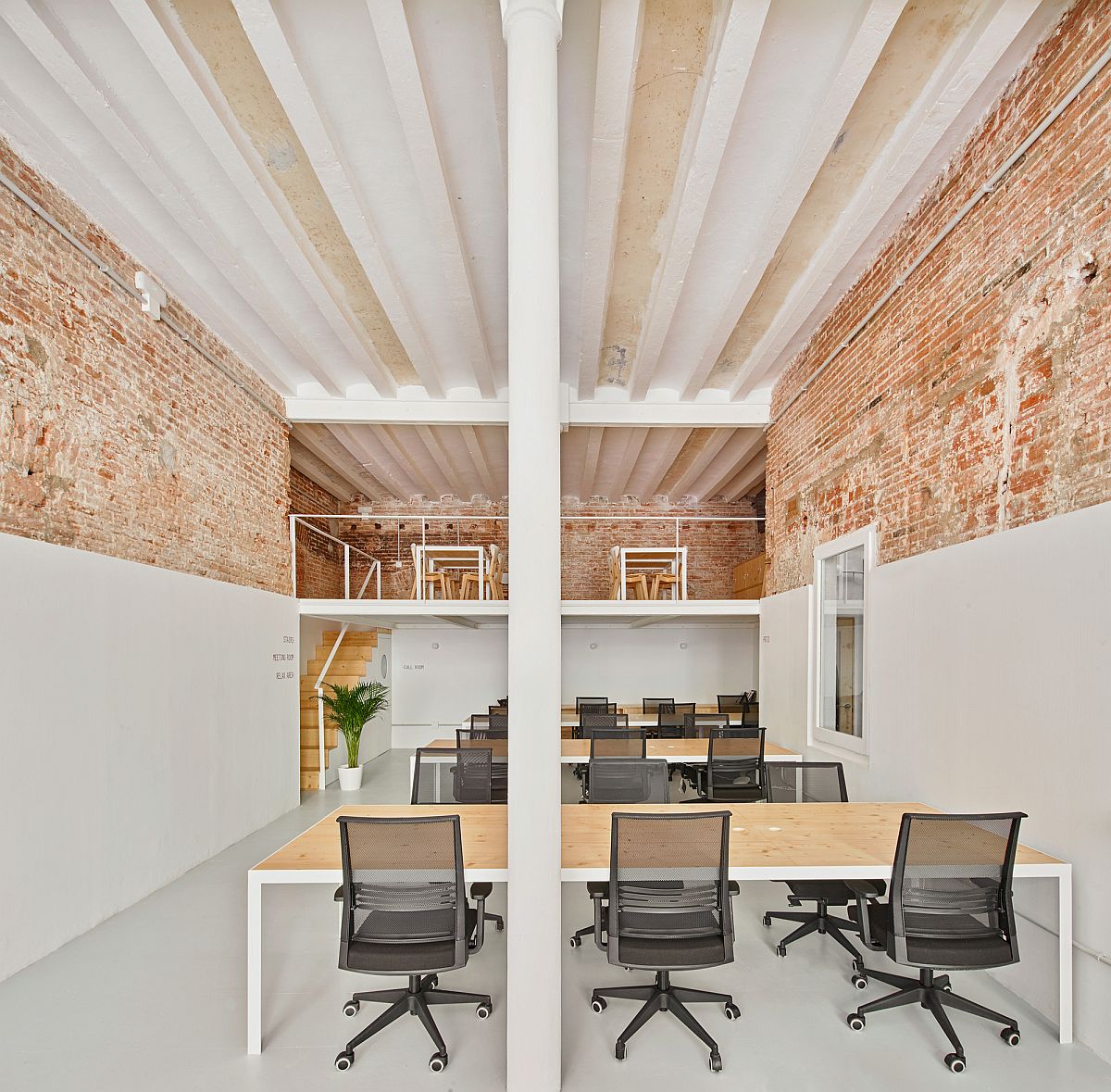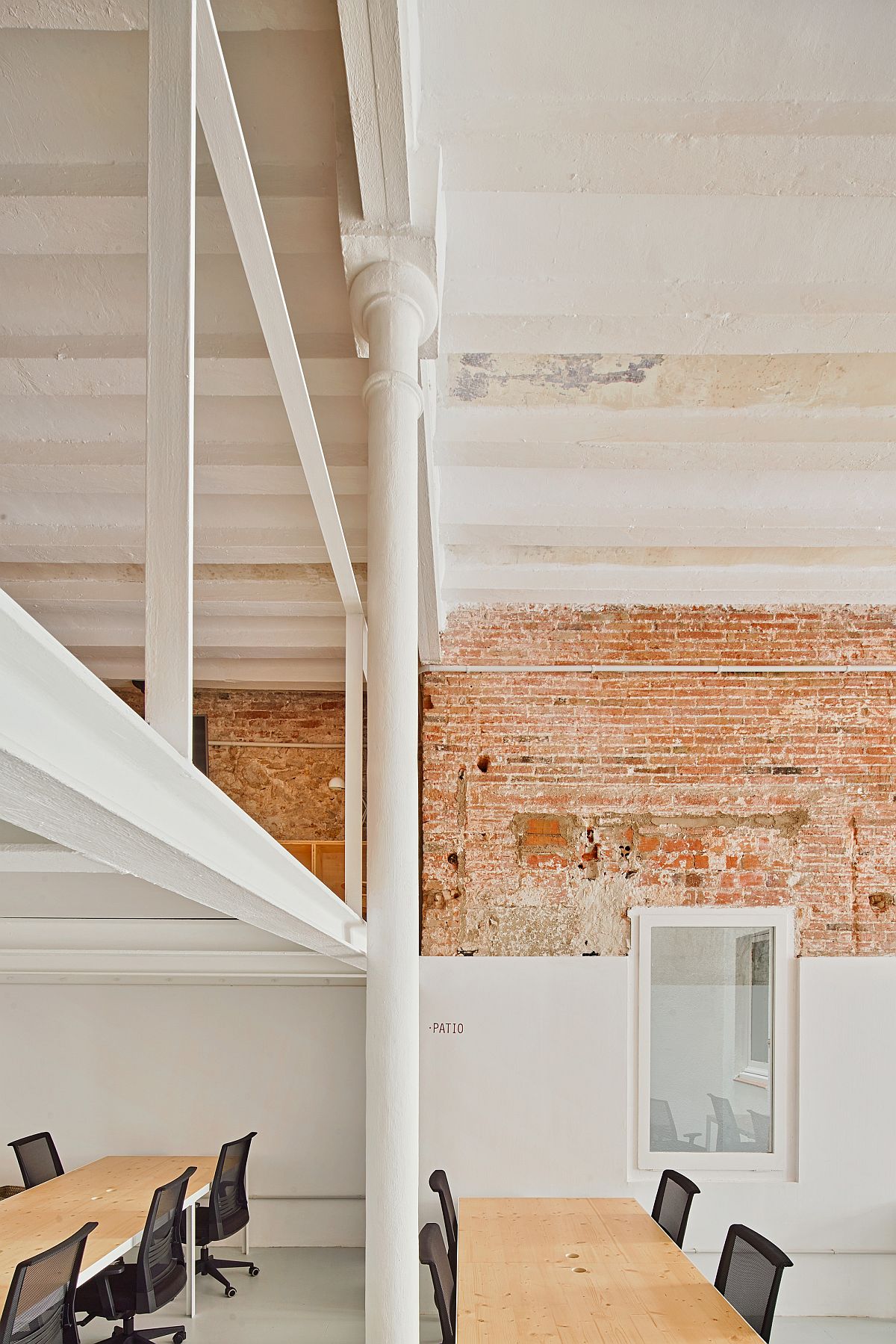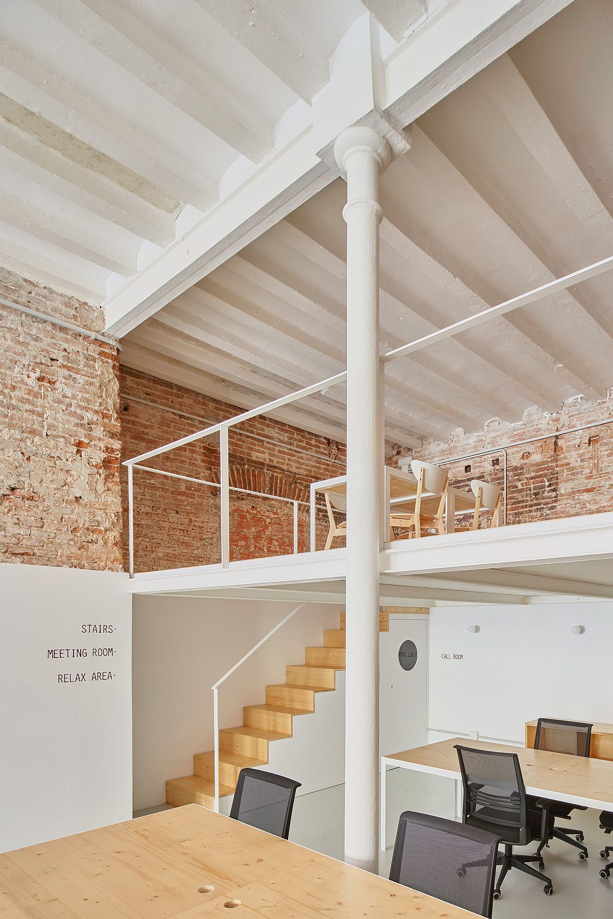 The central idea behind the makeover was simple as the architects stripped away additional layers of plaster and cement that were added over the last century or so to reveal the exquisite brick walls, stone sections and casted steel columns. This essential brings alive the past of the building and links it with the present in a fluid and effortless manner. A new mezzanine level was added to make the most of the double-height interior while four large wooden tables create the work area on the lower level.