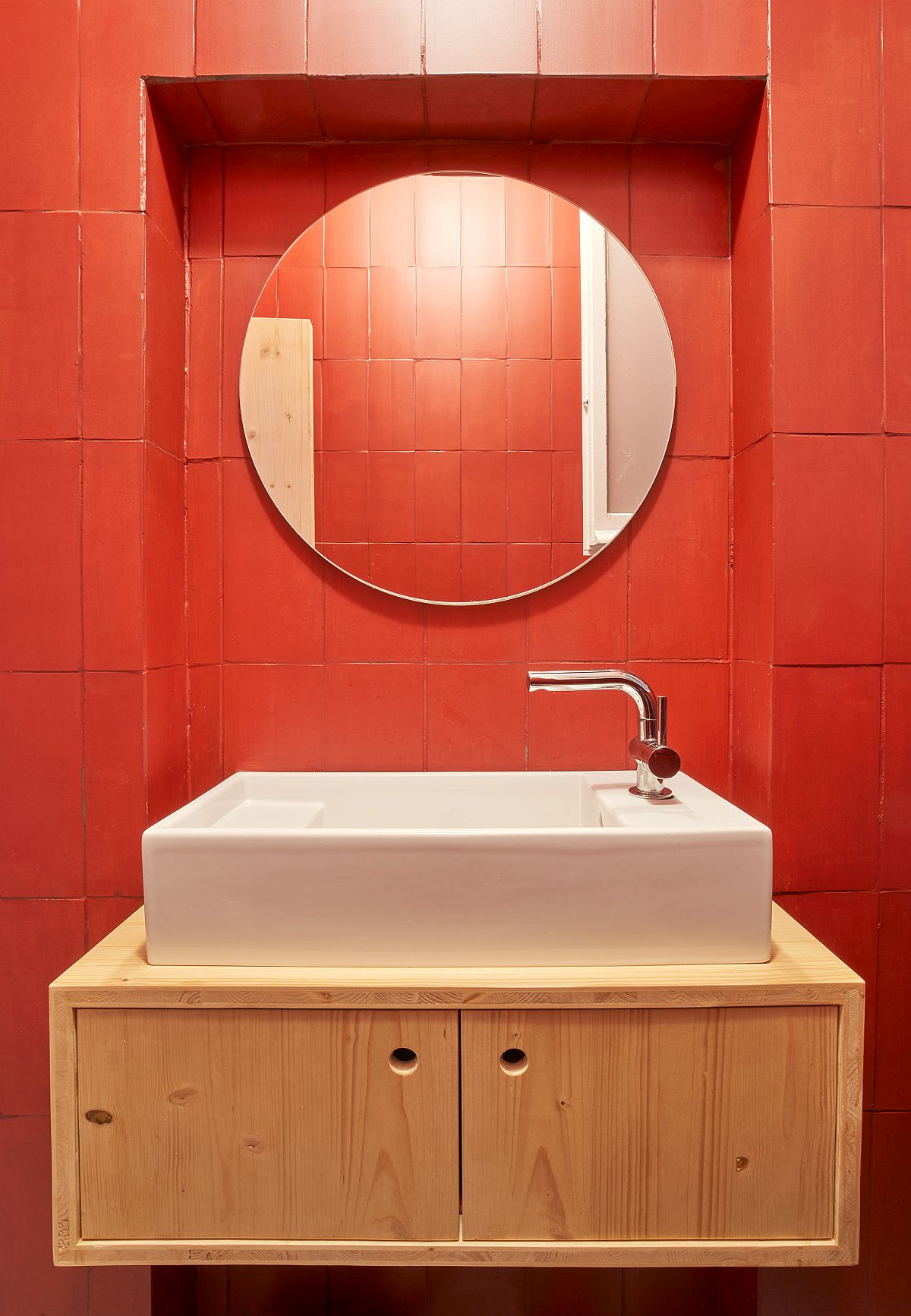 Custom wooden cabinets and décor provide the shelving, storage and kitchen units inside this office while the brick walls in the backdrop elevate the textural charm. White, wood and brick along with curated pops of red complete this immaculate office that stands out from the crowd! [From: José Hevia]